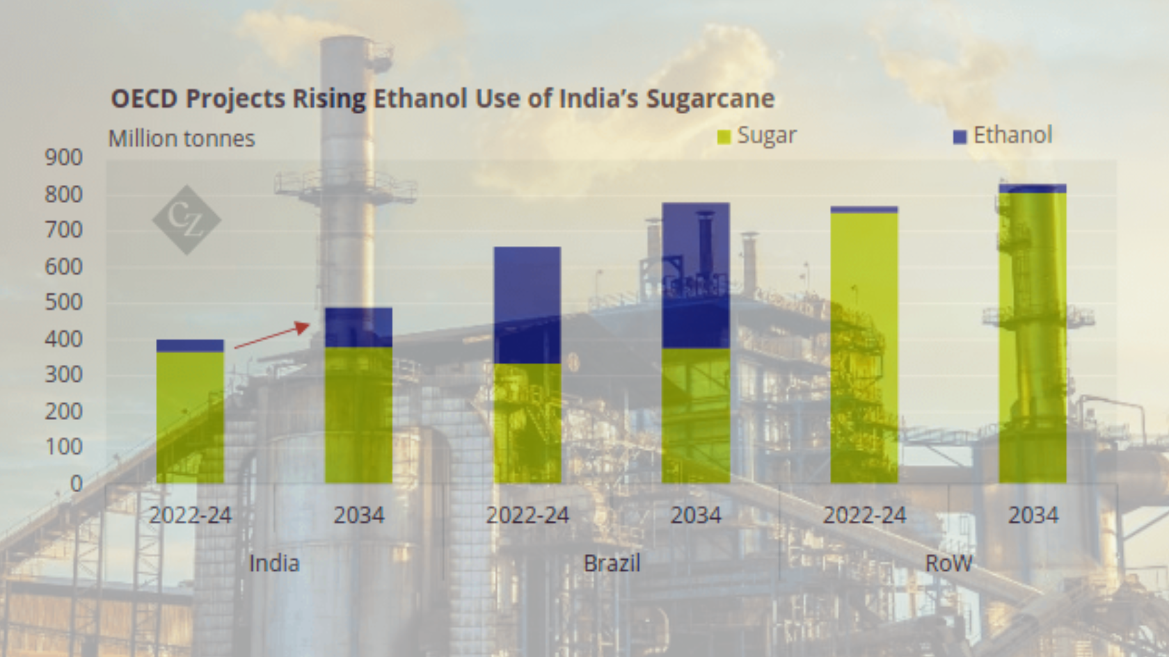 El informe Perspectivas Agrícolas de la OCDE y la FAO estima que hacia 2032 la industria del etanol de la India utilizará hasta el 22% de la producción nacional de azúcar, frente al 9% actual. India es el tercer mayor exportador de azúcar a nivel mundial, después de Brasil y Tailandia, y contribuye con alrededor del 8% de las exportaciones globales.