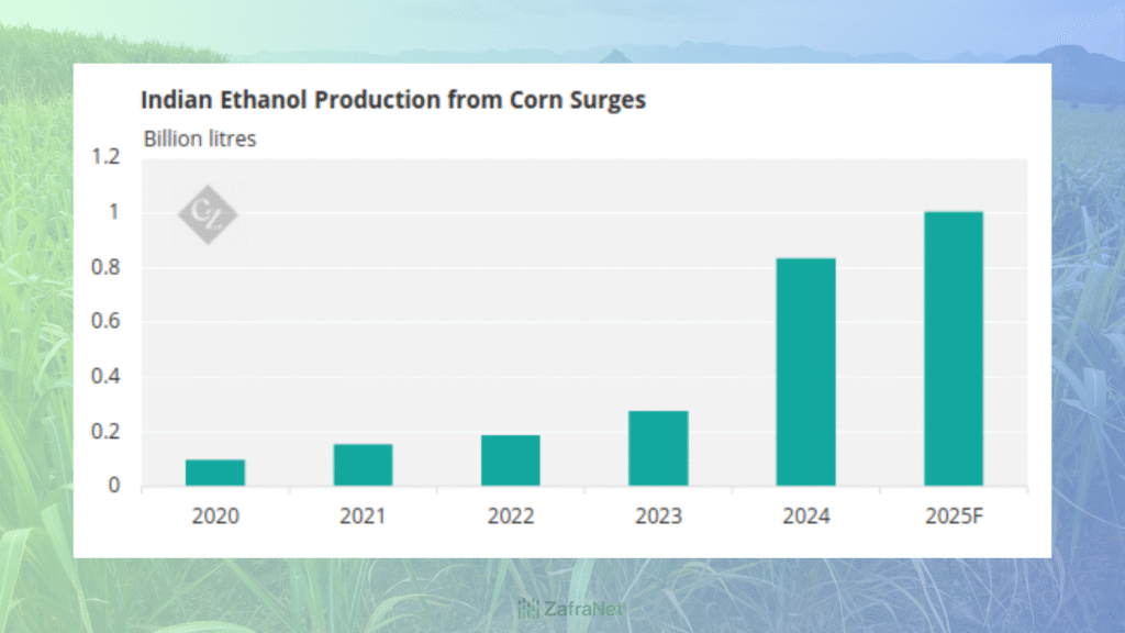 De acuerdo con el Economic Times, la producción de etanol a base de maíz pasó de 1 millón de toneladas en 2022 a más de 6 millones de toneladas en 2024, y se proyecta que llegue a 11 millones de toneladas a finales de 2025.