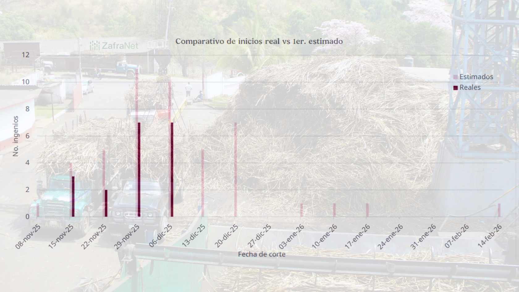 En cuanto al inicio de la zafra, al 06 de diciembre de 2025 se contabilizaron 19 ingenios en operación de manera acumulada, luego de que siete unidades industriales iniciaran actividades durante la semana. Esta cifra se mantiene por debajo del estimado acumulado de 31 ingenios para esa fecha, lo que refleja un arranque más paulatino del ciclo 2025/26.