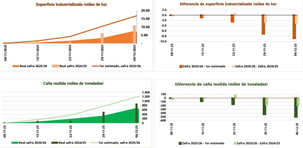 En cuanto al desempeño industrial acumulado, el rendimiento de fábrica se situó en 9.17 por ciento, con un incremento marginal de 0.02 puntos porcentuales frente al estimado y de 0.82 puntos porcentuales en comparación con la zafra 2024/25. A su vez, el rendimiento agroindustrial acumulado fue de 8.85 toneladas de azúcar por hectárea, superando en 1.96 toneladas por hectárea al primer estimado y en 1.68 toneladas por hectárea al ciclo anterior.