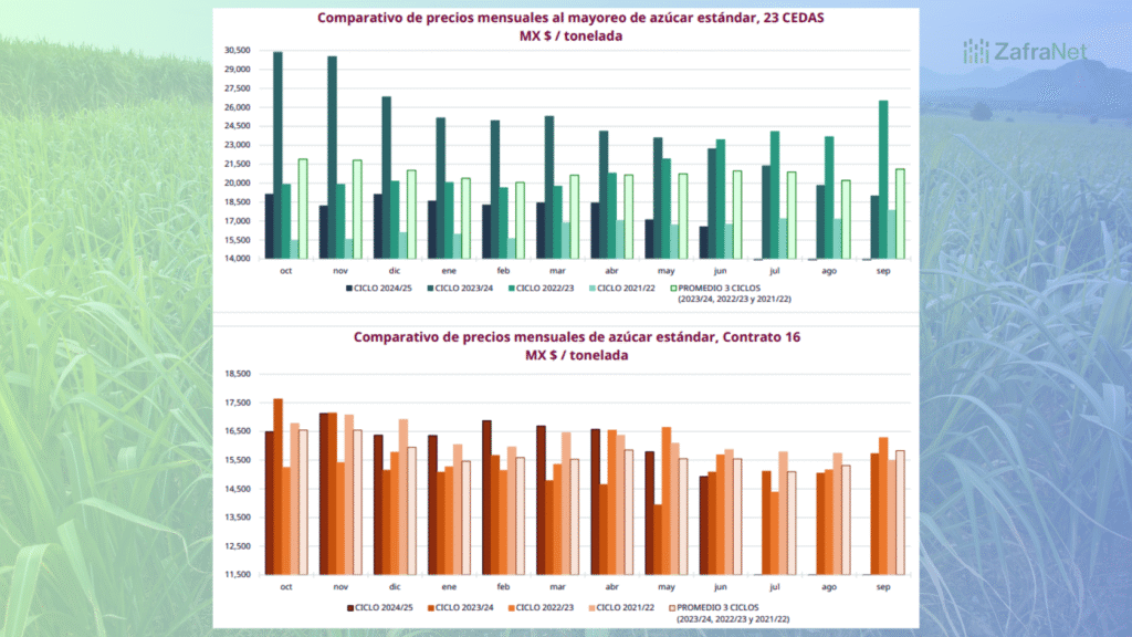Respecto al azúcar refinada, el precio promedio semanal en mayoreo en las 21 CEDAS fue de 23,638.39 pesos por tonelada, 22.87 por ciento menos que los 30,645.99 pesos del mismo periodo del ciclo previo. El promedio mensual alcanzó 23,728.99 pesos, con una disminución de 22.52 por ciento frente a los 30,626.66 pesos registrados en 2024. En cuanto al promedio del ciclo, este se ubicó en 25,413.26 pesos por tonelada, un descenso de 21.04 por ciento en comparación con los 32,184.71 pesos del ciclo anterior.
