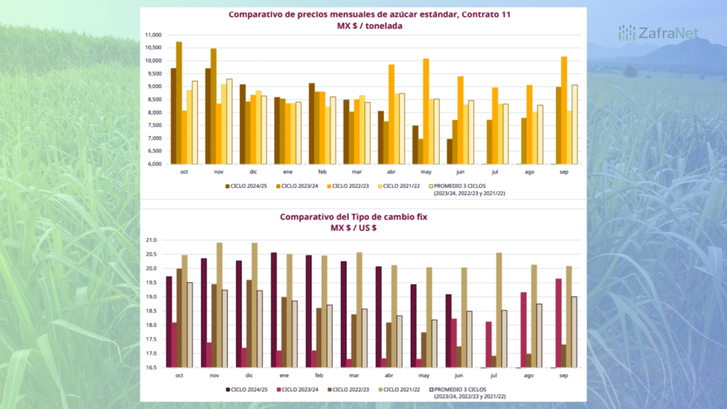 En el contrato 11, el precio promedio semanal cerró en 6,854.81 pesos por tonelada, lo que significó una caída de 12.14 por ciento respecto a los 7,802.32 pesos del ciclo anterior. El promedio mensual fue de 6,965.47 pesos, inferior en 8.62 por ciento a los 7,622.34 pesos del año pasado. El promedio del ciclo ascendió a 8,668.12 pesos, apenas 0.44 por ciento por encima de los 8,630.46 pesos registrados en el mismo periodo de 2023/2024.