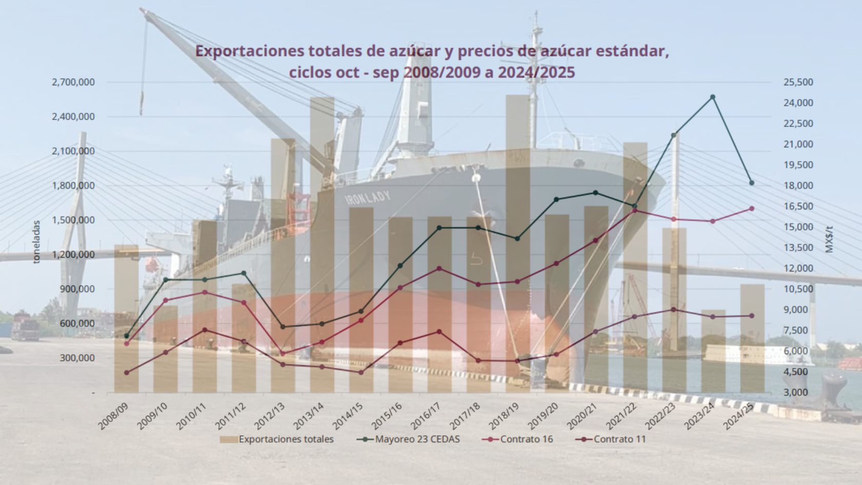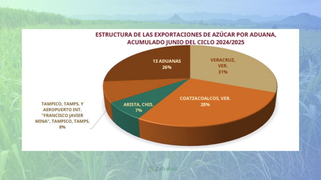 Al 30 de junio de 2025, las exportaciones totales de azúcar mexicana acumularon un volumen de 938 mil 198.63 toneladas en lo que va del ciclo azucarero 2024/25, lo que representa un aumento de 51.15 % en comparación con las 620 mil 693.50 toneladas registradas en el mismo periodo del ciclo anterior, de acuerdo con el reporte mensual publicado por el Comité Nacional para el Desarrollo Sustentable de la Caña de Azúcar (CONADESUCA).