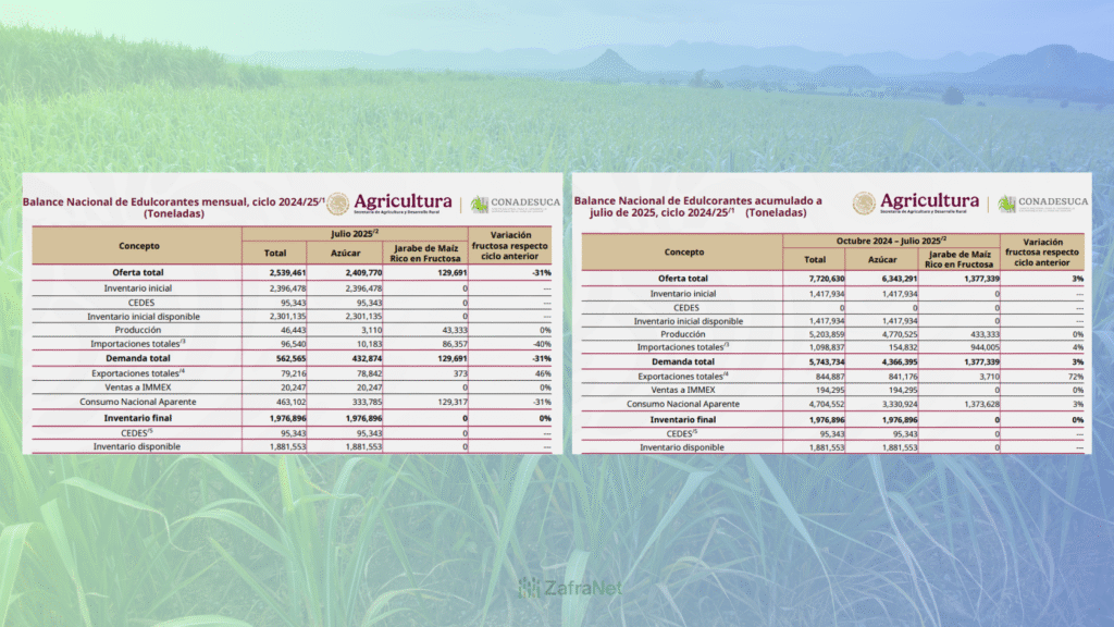 A nivel acumulado, de octubre de 2024 a julio de 2025, la oferta total de edulcorantes fue de 7 millones 720 mil 630 toneladas, lo que representa un incremento de 3 por ciento en comparación con el mismo periodo del ciclo anterior. De este total, 6 millones 343 mil 291 toneladas correspondieron a azúcar y 1 millón 377 mil 339 toneladas a jarabe de maíz.