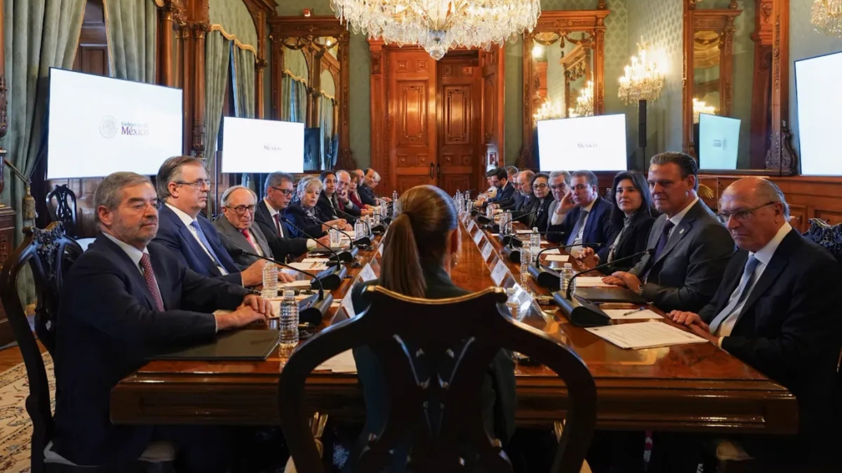 La presidenta Claudia Sheinbaum Pardo recibió en Palacio Nacional a la comitiva sudamericana y cerró sus actividades con una reunión privada de una hora con 15 minutos, acompañada por el canciller Juan Ramón de la Fuente y los secretarios de Economía, Medio Ambiente y Hacienda, Marcelo Ebrard, Alicia Bárcena y Edgar Amador, respectivamente.
