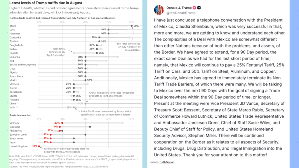 La prórroga evita, por ahora, la imposición de un arancel del 30 por ciento a la mayoría de los productos mexicanos no automotrices ni metálicos. Además, se avanzó en un acuerdo bilateral de seguridad que, según Sheinbaum, está prácticamente cerrado.