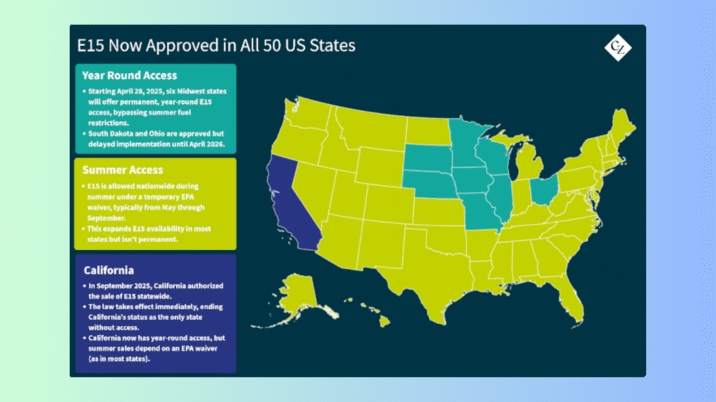 De acuerdo con CZ, la aprobación en California también otorga a la industria del etanol una nueva oportunidad para impulsar un proyecto de ley nacional que autorice la venta de E15 durante todo el año en Estados Unidos. Troy Bredenkamp, de la RFA, señaló que el proyecto de ley de gastos de fin de año en el Congreso, previsto para diciembre, podría ser un punto de partida para incluir una medida E15, posiblemente a través de la Ley Nacional de Elección del Consumidor y el Minorista de Combustible, respaldada por legisladores del Medio Oeste. Subrayó además que el apoyo del presidente Trump podría resultar decisivo para su aprobación, dada la actual presión sobre los agricultores frente a la cosecha récord de maíz que deprime los precios.